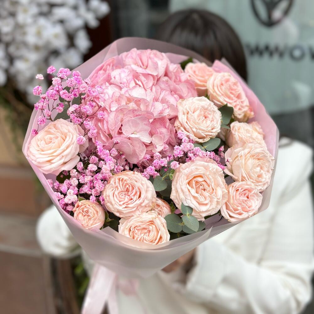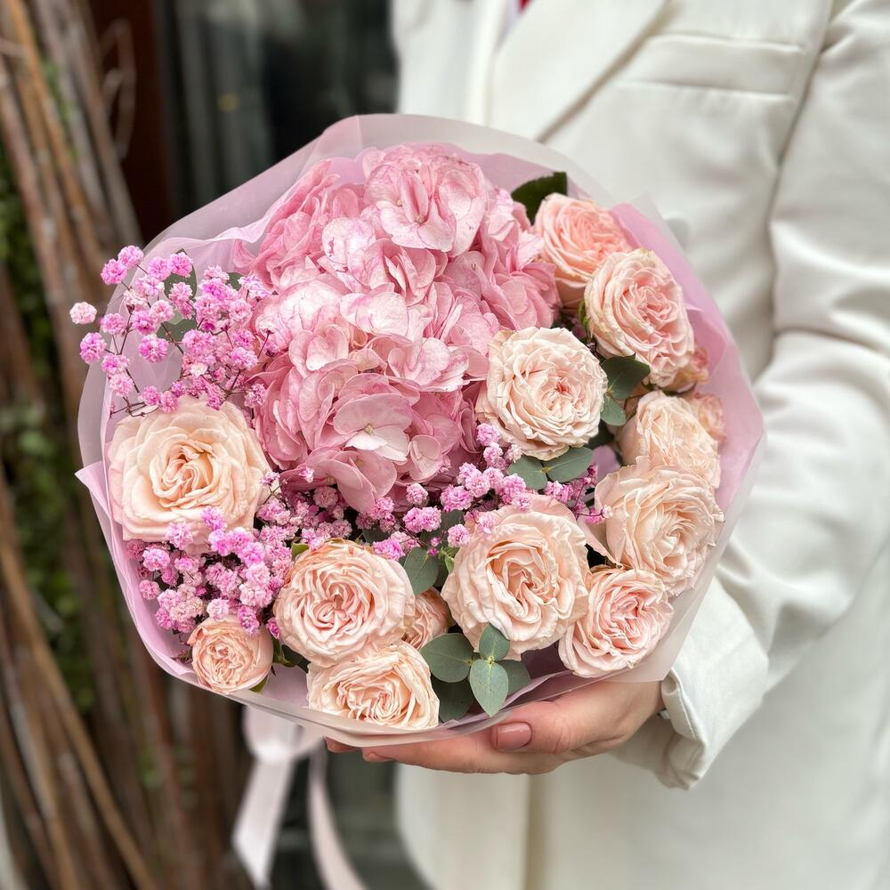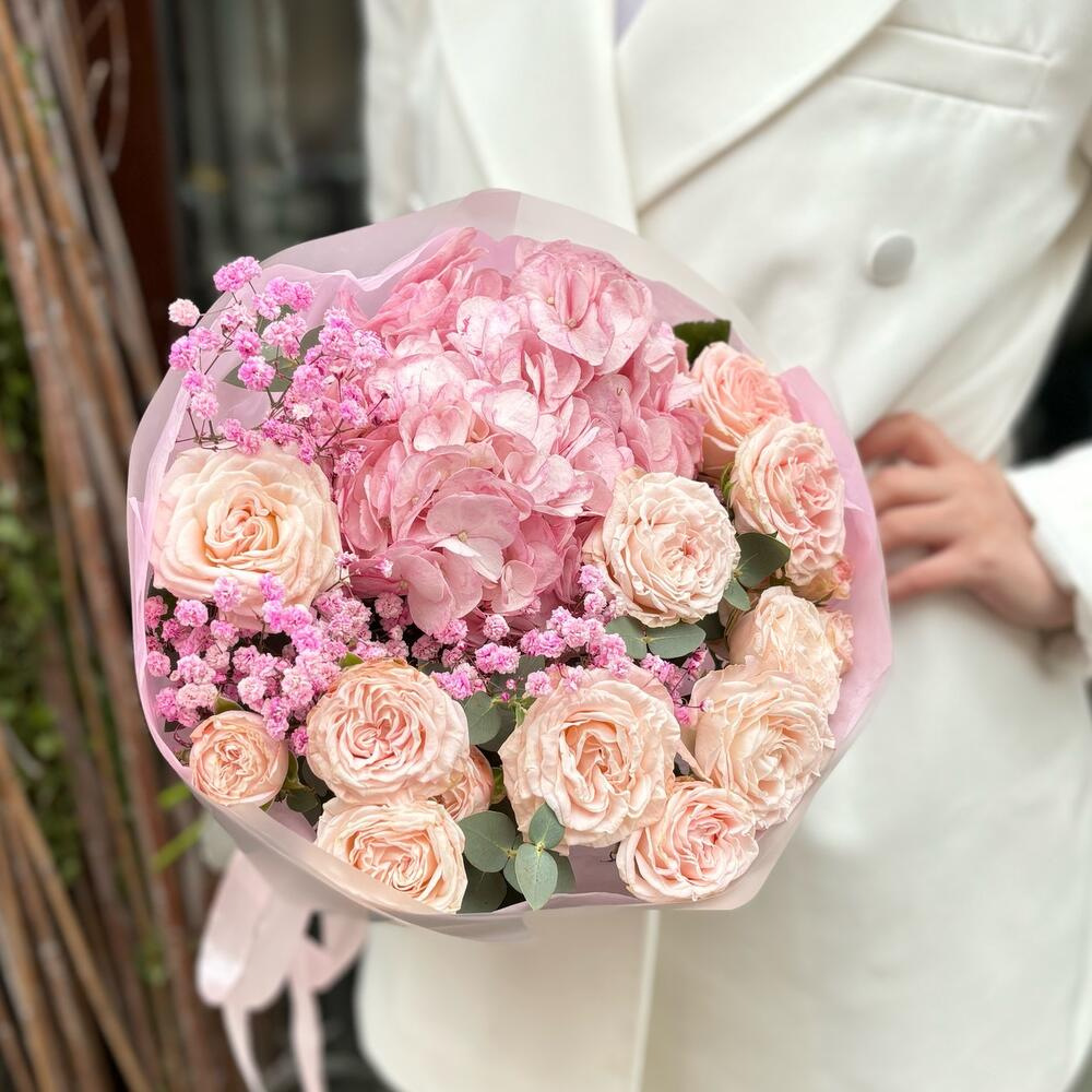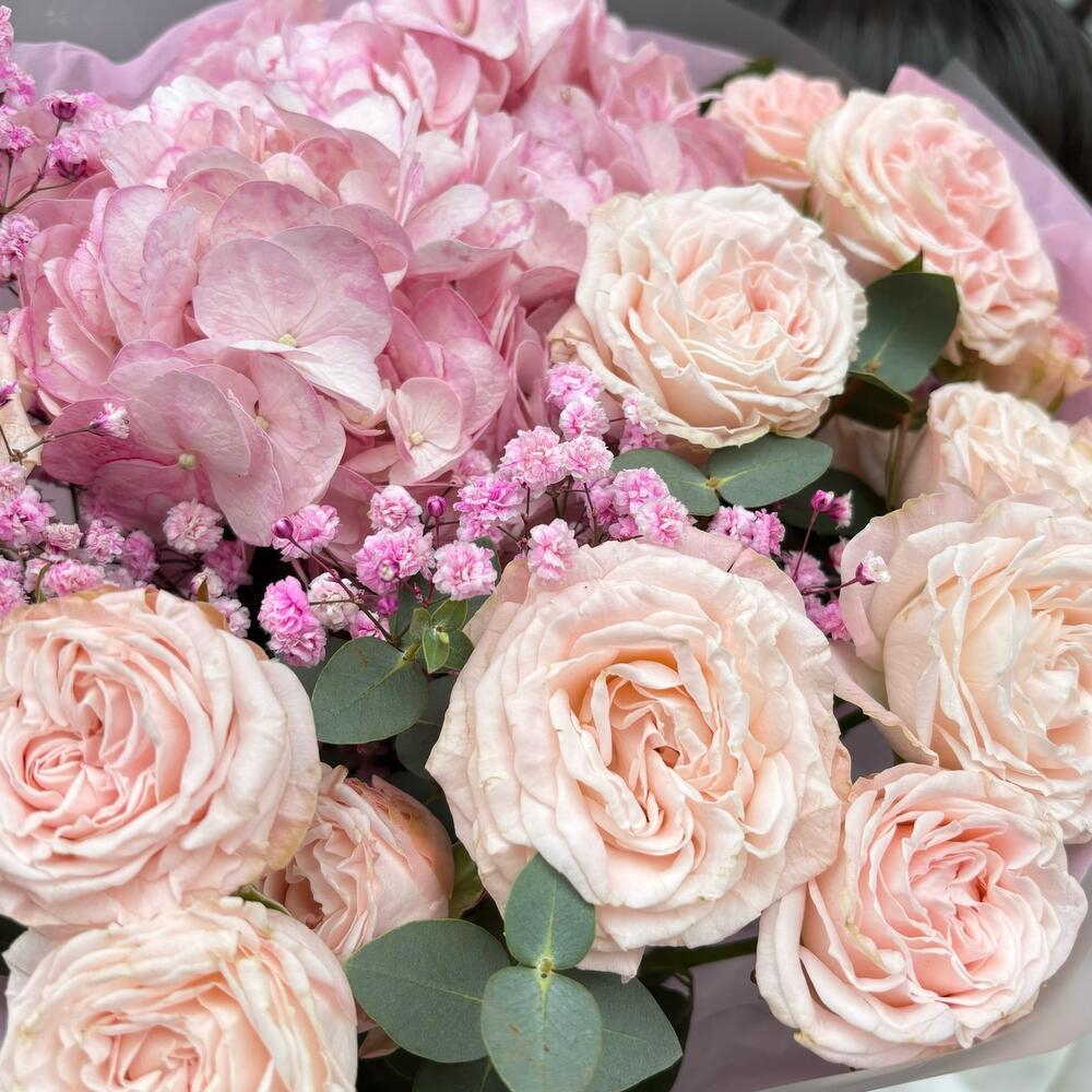• Buchet contine Gypsophila - 1 buc Hortensia - 1 buc Eucalipt - 9 buc trandafir - 3 buc Ambalare, verdeata decorativa - 3 buc