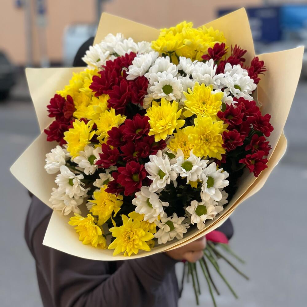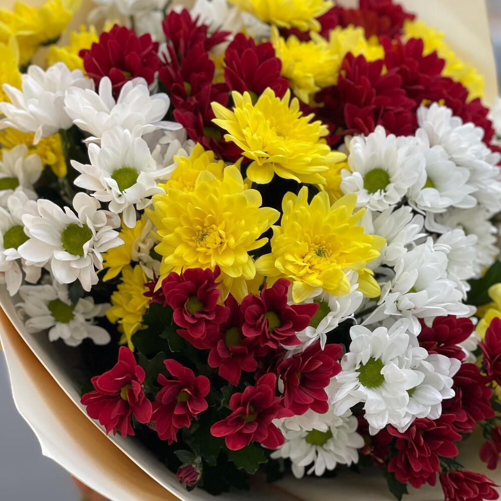 Buchet din 15 Crizanteme Albe, Roșii și Galbene