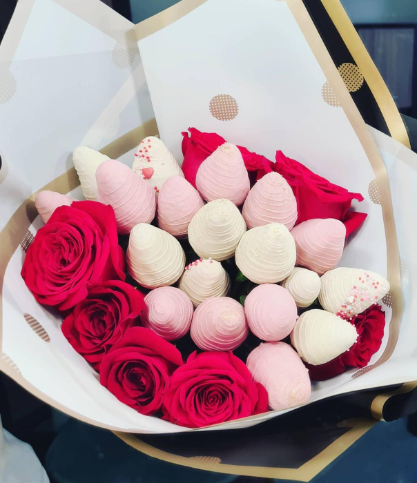 Iată cadoul perfect pentru a-i spune cât de mult o iubești!, realizat din 20 de căpșuni învelite în cea mai fină ciocolată belgiană și 7 trandafiri roșii. Fructele sunt învelite în ciocolată albă, ciocolată ruby cu lapte și decorate cu perle din zahăr comestibile. Fiecare căpșună este realizată exclusiv manual, pentru ca tu să te poți bucura de o experiență unică, creată doar pentru tine!