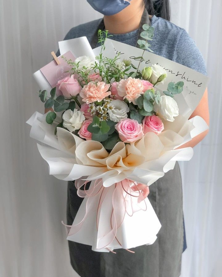 Acest buchet contine 9 trandafiri roz ,garoafe , lisianthus, eucalipt si margarete.