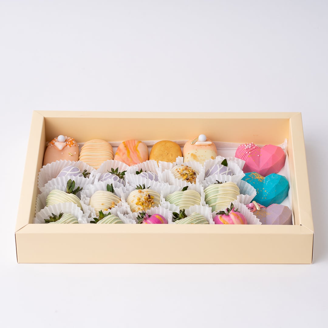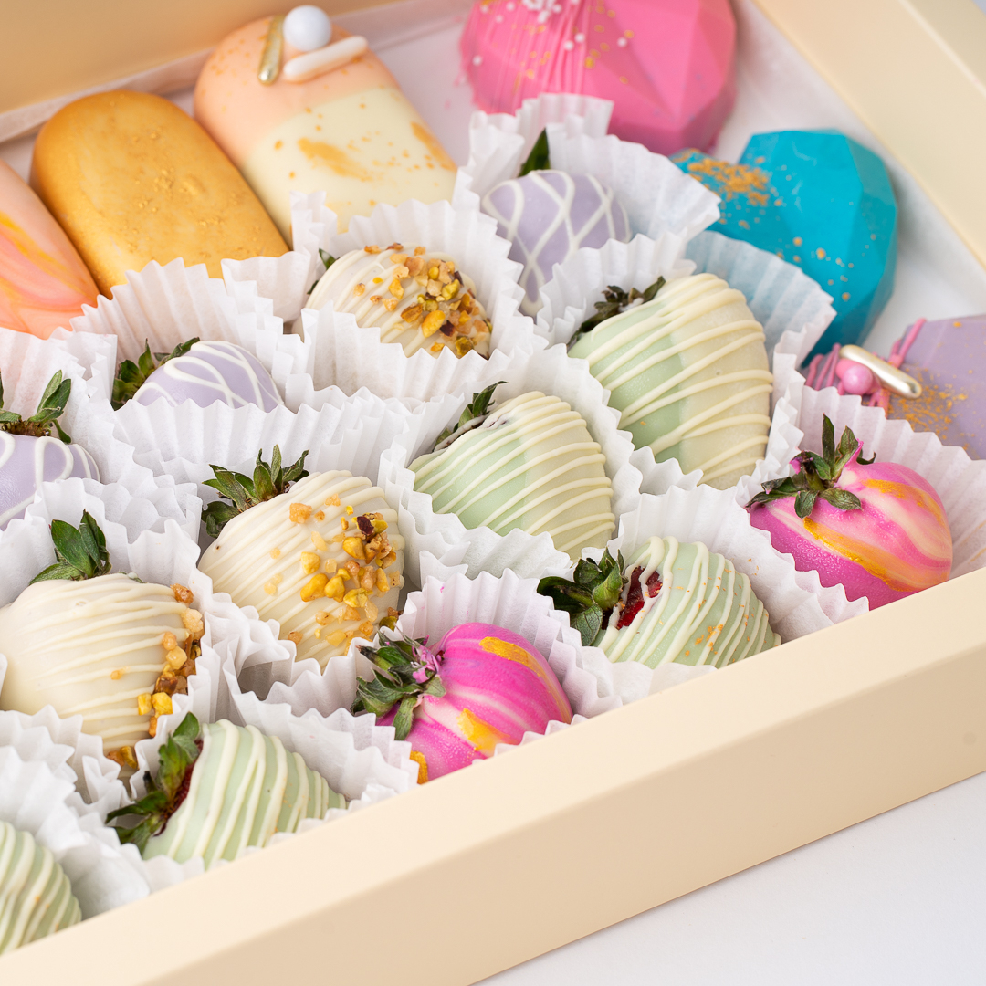 Cutia conține 5 cakesicles, 15 capsuni in ciocolata și 3 inimi 3D, decorate cu bomboane, sclipici comestibil și fistic caramelizat.